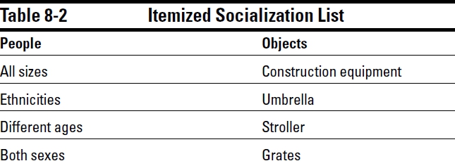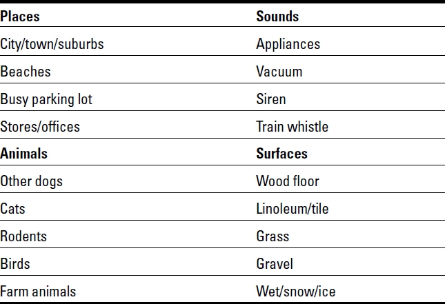 The goal in early socialization is to build up your puppy’s bank of experiences so that throughout her life, she’ll be less surprised by the variety of things that life will throw at her. Refer to Table 8-2 or create your own list of objects that you’re likely to come across in your daily adventures. Introduce your puppy to these objects one at a time, always keeping in mind the following: