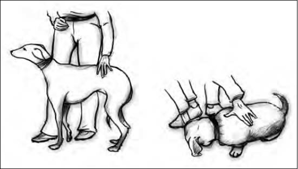 • Proper greeting: Puppies jump up to get closer to your face. Help your puppy learn a more acceptable greeting ritual. Whenever you greet your puppy or are introducing her to someone new, brace her by looping your thumb over the bottom of her collar and holding her waist to prevent jumping as you repeat the direction, “Say, hello.” Another option is the reverse yo-yo, as illustrated in Figure 8-1. Leave a 4-foot leash on your puppy and step on it before greeting your company. If your puppy does jump, he’ll be brought down: Introduce him when he’s calmer. (For more insights, see Addressing and Solving Problem Behavior.)