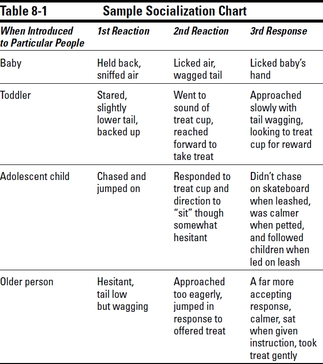 It is possible to begin introducing your puppy to new experiences as early as 4 weeks of age. After 14 weeks of age, your puppy will be more rigid in her associations and less impressed by your example. Use Table 8-1 to monitor your socialization program.