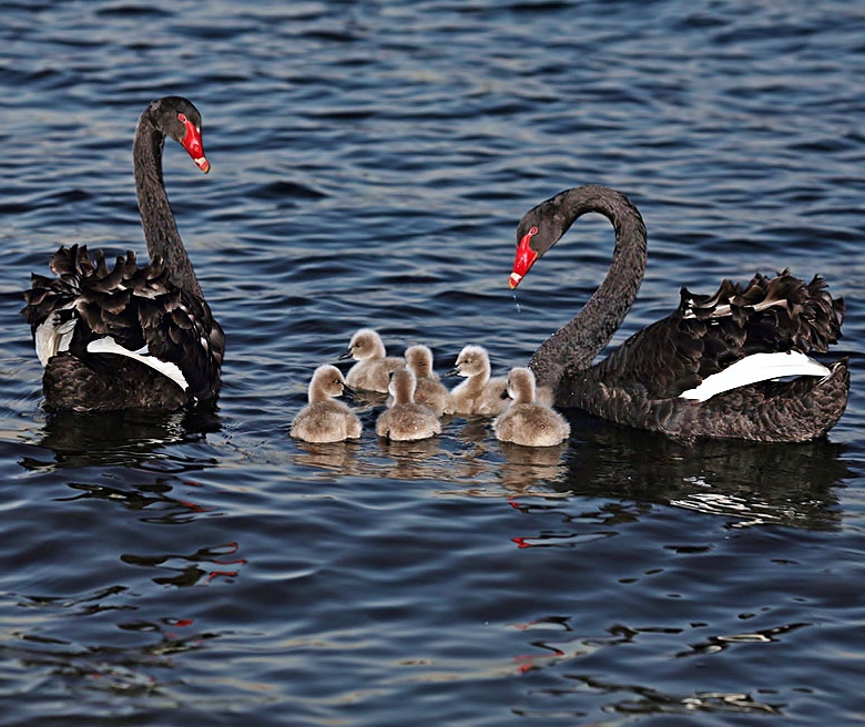 Within their native range, black swans breed in February-September. They are largely monogamous and most often pair for life. Typically, the female builds the nest, a floating mound of sticks, dead leaves and debris, on shallow water or sometimes in small islands. There she lays 4-8 greenish-white eggs, which are incubated by both sexes for 35-48 days. The precocial chicks leave the nest 2-3 weeks after hatching and are able to feed themselves, but only fledge 5-6 months after hatching and may remain with their parents for even longer. During this period they are protected by their parents and in the first weeks they may even ride on their backs.