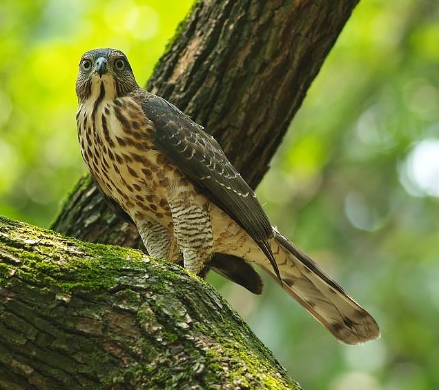 The crested goshawk relying on surprise as it flies from a perch to catch its prey unaware. Their main preys are squirrels, rodents, bats, birds and reptiles, namely common flamebacks Dinopium javanense, black-and-yellow broadbills Eurylaimus ochromalus and the slender squirrel Sundasciurus tenuis.