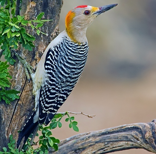 Golden-fronted woodpeckers nest in holes excavated into trees, fence poles, posts or sometimes cacti. The female lays 4-7 white eggs which are incubated by both sexes for 12-14 days. The chicks are fed by both parents and fledge 30 days after hatching. Each pair may raise 1-3 broods per year.