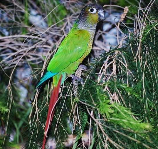 The green-cheeked parakeet is found is forests and open woodlands, from sea level up to an altitude of 2.600 m.