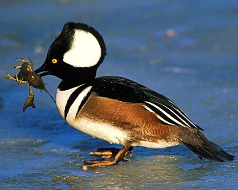 Hooded mergansers are mostly carnivorous, eating fishes, aquatic insects and crustaceans. They sometimes also eat aquatic plants.