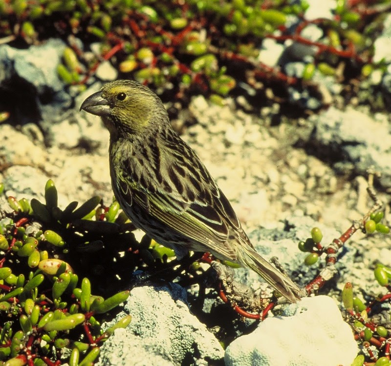 The Laysan finch is found in dry scrublands and grasslands, using low scrubs, bunch grasses and forbs, particularly the beach naupaka Scaevola taccada.