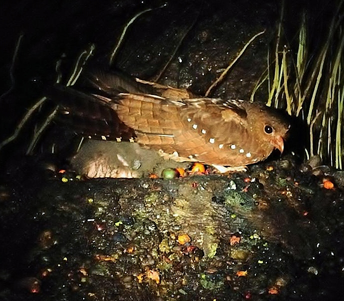Oilbirds are colonial cave nesters and appear to be monogamous. The nest is a large, truncated cone made of concentric layers of regurgitated seeds, droppings, mud and fruit pulp, all held together with the birds’ saliva. The nests are placed in cave ledges and shelves close to the cave ceiling, up to 30 m above the ground. The female lays 2-4 glossy white eggs which are incubated by both parents for 32-35 days. The chicks are fed by both parents and fledge 100-115 days after hatching.