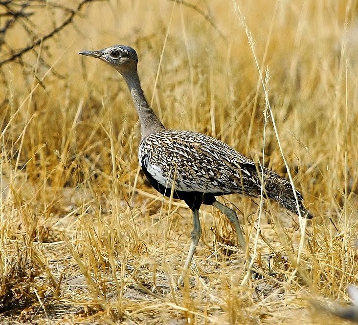 The red-crested bustard is found in dry savannas and scrublands, favouring areas dominated by mopane Colospermum mopane, Acacia, cluster-leaf Terminalia, Zambezi teak Baikiaea plurijaga and miombo Brachystegia.