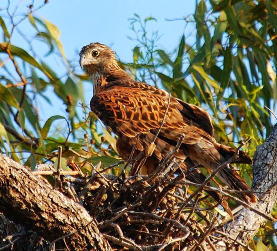 Red goshawks breed in My-December. They are probably monogamous and breed in solitary pairs. The nest is a large structure made of dead sticks with a saucer-shaped hollow top, thickly lined with finer twigs and green eucalyptus leaves. It is placed on an exposed fork in a tall tree, 15-30 m above the ground, and within 1 km of a watercourse or wetland. The female lays 1-2 eggs, which she incubates alone for 39-43 days while the male brings her food. The chicks are fed by both parents and fledge 51-53 days after hatching, but continue to be receive food from the parents for another 70–80 days.