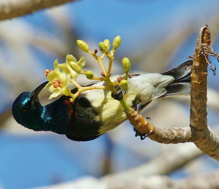 The souimanga sunbird is found in tropical and sub-tropical forests, mangroves and scrublands, but also in gardens, parks and degraded patches of former forest. They are present from sea level up to an altitude of 2.300 m.