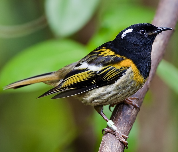 This species has a very small breeding range and a global population estimated at just 3.000-4.500 individuals. There is no detailed information on population trends, but it believed to be declining. The stitchbird became extinct on the North Island mainland, probably due to the introduction of black rats Rattus rattus, avian desease and probably also deforestation in parts of its original range. Conservation efforts lead to the translocation of individuals into two offshore islands and a couple of areas in North Island but they appear to require large expanses of mature forest to survive which represents a major hurdle to conservation efforts.