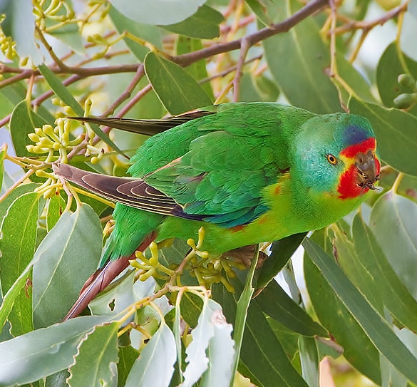 The swift parrot feeds mostly on nectar, mainly from eucalypts, but also eats psyllid insects and lerps, seeds and fruit.