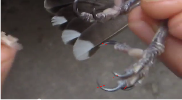 +Cắt móng chân :Anh em nhìn móng chân chim chia ra 3 phần,cắt đi 1 phần ( cắt 1/3 móng chim).Cắt chéo để móng có độ nhọn cho chim bám.Hoặc có thể đưa móng ra hướng mặt trời rồi nhìn vào móng,chỗ nào đen hết là cắt,chỗ có màu đỏ là mạch máu của chim.Tránh cắt móng làm chim chảy máu.Anh em nhìn hình bên dưới mình có gạch dấu đỏ,và cắt chéo giống vậy nhé.