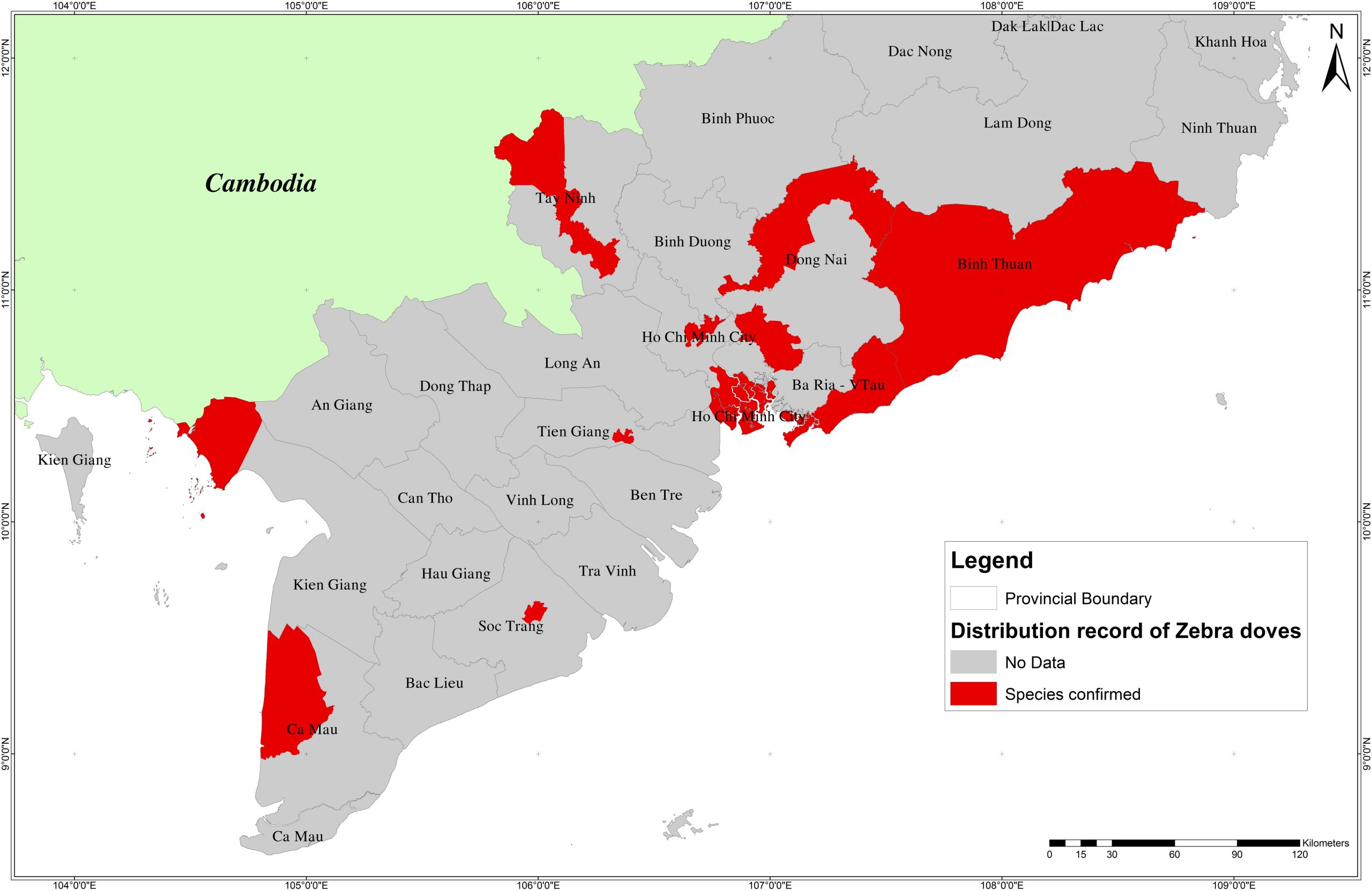 Hình 2. Các khu vực ghi nhận cu gáy vằn ở Việt Nam (màu đỏ)