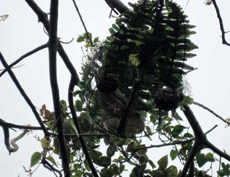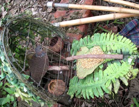 Treo lồng cu gáy trên cành cây để bẫy chim ngoài.