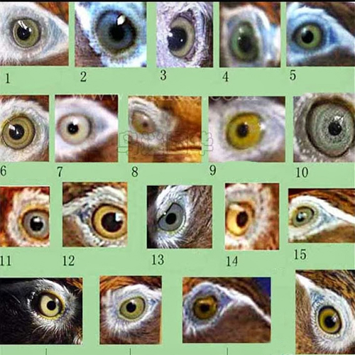 (1,Lục đậu thanh. 2,Thiên lam thanh. 3,Bạch nhãn thủy. 4,Phỉ thúy lục. 5,Bảo thạch lục. 6,Hoàng kim sa. 7,Nguyệt bạch nhãn. 8,Sà nhãn. 9,Thái hoa hoàng. 10,Đạm lục sa. 11,Khôi bạch thủy. 12,Kim hoàng sa. 13,Khôi nhãn. 14,Hoàng kim nhãn. 15,Đại thanh nhãn. Bốn con mắt còn lại được ghi chú là “Tần lãnh bắc pha điểu” nghĩa làchim vùng núi cao bắc nước Tần.)