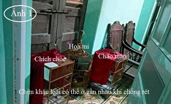 Ở vùng này khí hậu ôn hòa hơn, ít khi nhiệt độ môi trường xuống đến dưới 10 độ C nên việc chống rét cho chim cũng đơn giản hơn. Ban ngày ta khoác áo lồng, hé ra một chút và để ở nơi ít gió là được. Ban đêm lạnh hơn, có thể cho chim ở chung phòng với người là tốt nhất. Vài ba con chim khác loài ở trong một phòng như hình 1 là OK rồi. Nếu bạn nào dùng máy sưởi điện nên dùng kèm với máy phun sương để tránh không khí quá khô, gây bệnh cho chim và người. Ở nông thôn thường có nhà bếp riêng và kín gió, để chim trong bếp cũng tốt nhưng chú ý chống mèo, chuột xâm hại.