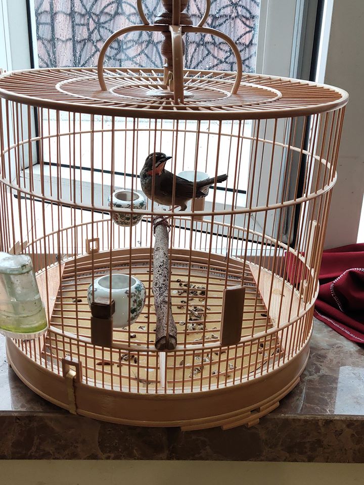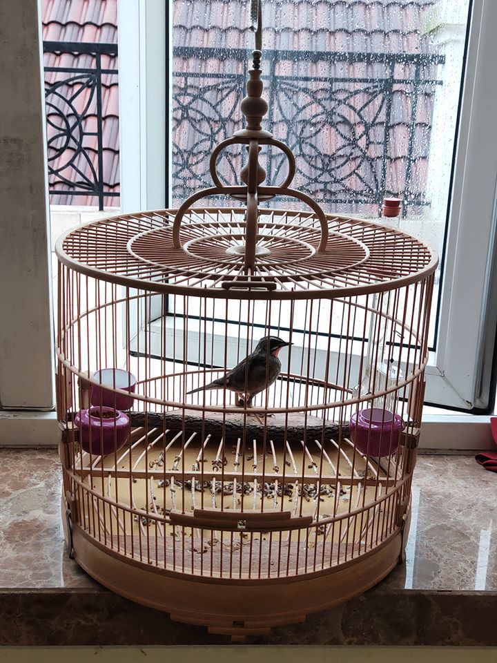4. Khi đã lành hơn thì nuôi loại lồng có thiết kế kiểu này, chim nhảy xuống sàn phẳng rồi nhanh chóng nhảy về cầu, nan đáy giúp chim không dẫm phân nên khá sạch sẽ.