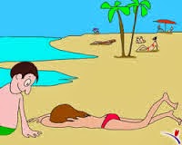 Một cô gái mặc đồ tắm hai mảnh xuống hồ. Do vận động quá mạnh, mảnh dưới của cô tuột ra. Hoảng hồn, cô gái vội vơ một tấm biển đặt cạnh hồ che và định chạy vào trong. Nhưng khi cô cầm tấm biển, mọi người đều cười! Cô nhìn xuống tấm biển thì thấy dòng chữ:” Trơn trợt, cấm đùa giỡn!”. Cô vội thay tấm biển khác. Trớ trêu thay! Mọi người càng cười lớn hơn. Lần này, tấm biển ghi:” Khu vực dành riêng cho nam giới”. Mặt đỏ ửng, cô đổi tấm biển lần nữa. Tới lúc này, mọi người nhìn cô bằng ánh mắt kinh hãi. Cô thấy ngạc nhiên nên nhìn vào tấm biển. Trên tấm biển ghi:”Nguy hiểm, độ sâu 1m8″.!