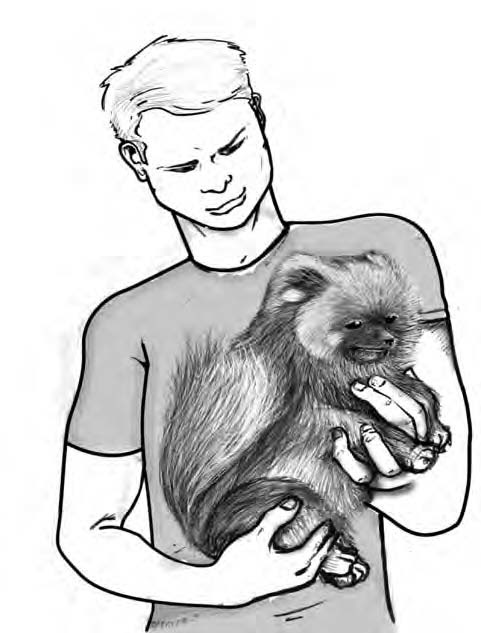 Everyone in the house needs to know how to hold a puppy (see Figure 6-1). Always pick the dog up with one hand cradled under her chest (never by her legs, nape of neck, or anywhere else). Then rest the dog against your chest and hold her securely underneath with your other hand.
