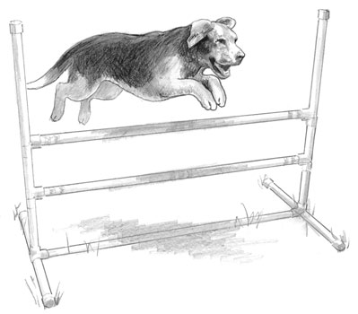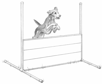 – Panel jump: This one looks like a solid wall. A dog must clear this jump without touching it. Hard to do — from my vantage, climbing over looks like more fun! See Figure 11-4.