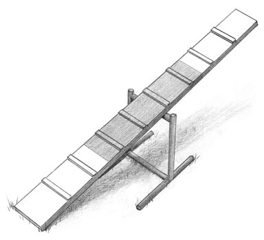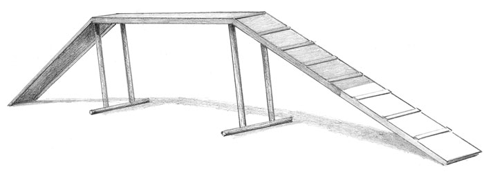 – The A-frame: Two 4-foot panels are arranged at a climbing angle (specified according to the size of each dog in timed trials). A dog must climb up — that’s the fun part — and then descend carefully. See Figure 11-7.
