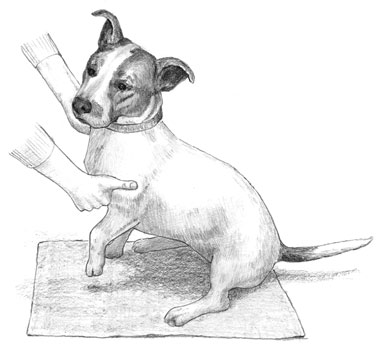 • Physical: Using a thumb, press your dog’s shoulder muscle gently until her front leg lifts, as shown in Figure 6-1. Then lay your hand under her foot pad as you say “Paw.”