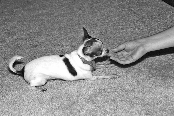 To teach the Down command, start with your Chi in the Sit position (see the preceding section). Now follow these steps: