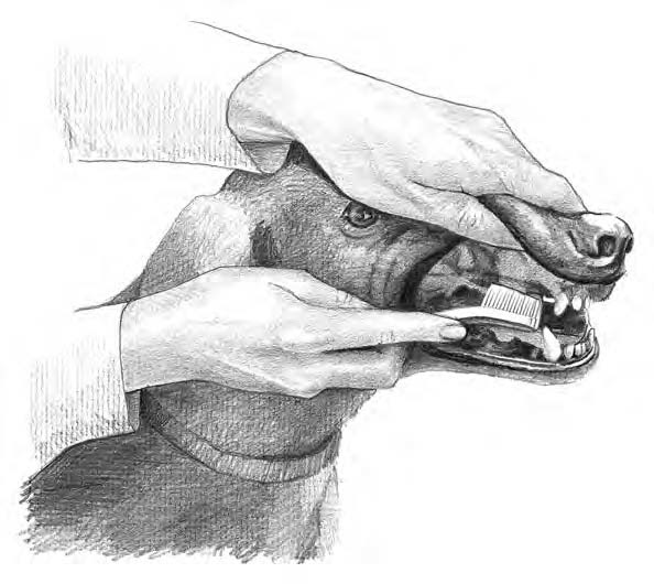 Place a little paste on the brush and begin brushing the front teeth. These are the easiest to start with because they don’t require your pushing the brush farther into the dog’s mouth. Brush in a circular motion so that you cover each tooth. Remember to brush the back of each tooth (the side closest to the tongue). Be sure to give your dog frequent breaks to lick the paste off her teeth, which will keep the experience positive for her. When she’s relaxed, work on the teeth farther back in the mouth. Gently pull the dog’s skin away from the teeth (as shown in Figure 8-1), so you can access the teeth easier.