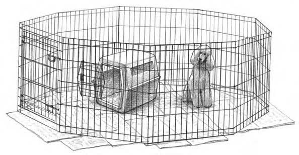 Depending on the flooring, you may want to put down a large piece of plastic to protect it. A shower curtain makes for an inexpensive barrier. Figure 9-1 shows a setup for paper training.
