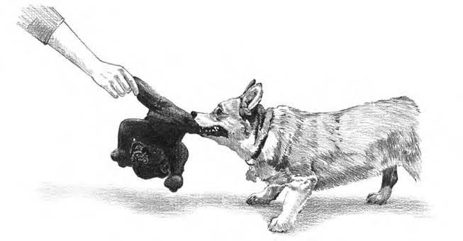 No tug of war, please! Even though your puppy will bait your children and your kids will like the game, discourage it. Your puppy must learn that when hands are touching an object, teeth let go — period. Tug of war can lead to serious consequences because your puppy most likely won’t be able to distinguish between a stuffed toy or leash and an item of clothing (see Figure 8-2).