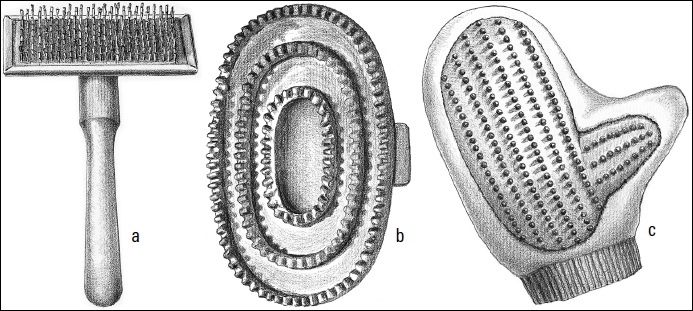 - Slicker brush (see Figure 3-1a): You need at least two types of slickers to handle brushing — one with soft bristles to use on faces and sensitive areas and another with harder bristles for more vigorous grooming. A slicker is a necessary brush, more or less, for all breeds except the hairless variety.