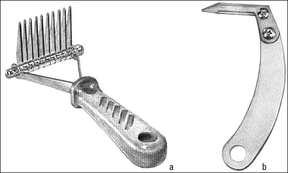 – Mat splitter (see Figure 3-4b): A mat splitter is an essential piece of equipment for any dog with medium to long hair. Mat splitters come in different forms, but they work by cutting through the mat safely while you’re combing the dog’s coat. They occasionally need to be sharpened. Cost runs about $10 to $30.