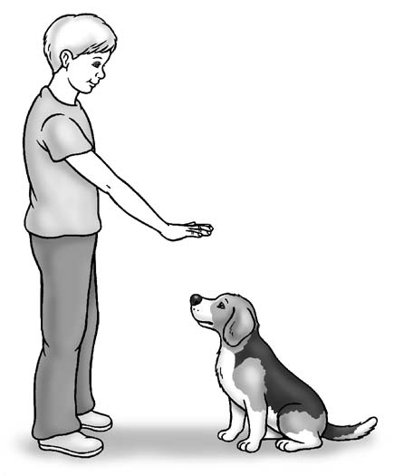 4. Move the treat down to the ground about 6 inches in front of your Beagle (see Figure 15-3a).