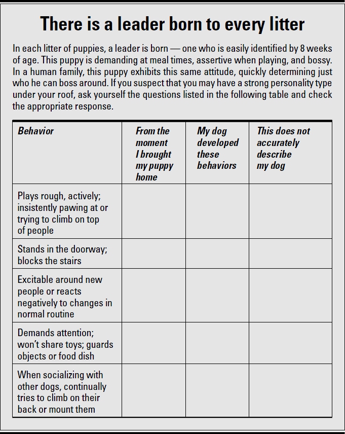 If your dog developed these traits during his adolescence or later, he has taken the leadership role only because you did not. So you need to change your behaviors to regain your status, and although you need to be consistent, this dog will be grateful that you’re taking over this demanding job. Being a leader is hard work!