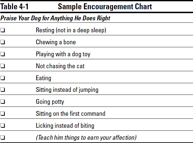 Make an Encouragement Chart, shown in Table 4-1, and share it with family and friends. Teach your dog what he can do to please you, no matter how insignificant it may seem.