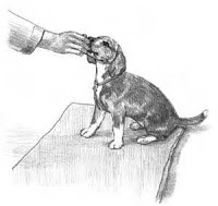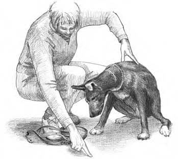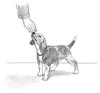 3. Your puppy may not know what to do, so as he looks down, press gently between his shoulder blades with your left thumb and press him gently into position (see Figure 14-2).