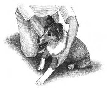 To position your pooch, lift up on his buckle collar and tuck his hindquarters into position, squeezing his waist muscles below his ribs as you press down.