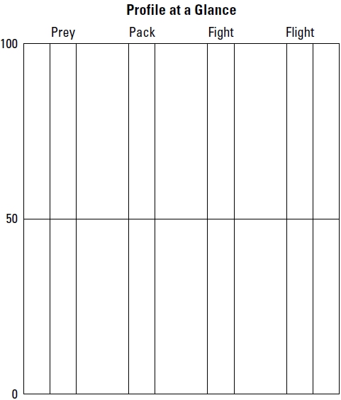 – Teacher’s Pet — medium (50 to 75) prey, pack, and defense (fight): This dog is easy to train and motivate, and mistakes on your part aren’t critical. Teacher’s Pet has a nice balance of drives. He’s easily motivated and therefore quite easy to train — even when your training skills aren’t particularly keen. At our training camps and seminars, we have the owners put the profile of their dogs in graph form for easy reading. Figure 5-4 shows the graph for Teacher’s Pet.