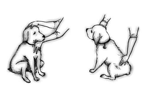 Ignore your dog if she behaves in an overexcited or inappropriate manner when you or other family members arrive. If she has been confined alone in a crate, pen, or room, don’t speak to her until she has calmed down or is chewing on a toy. After she has calmed down considerably, brace her as you greet her (see Figure 7-1), with your thumb clipped over the underside of her collar to prevent her from jumping up.