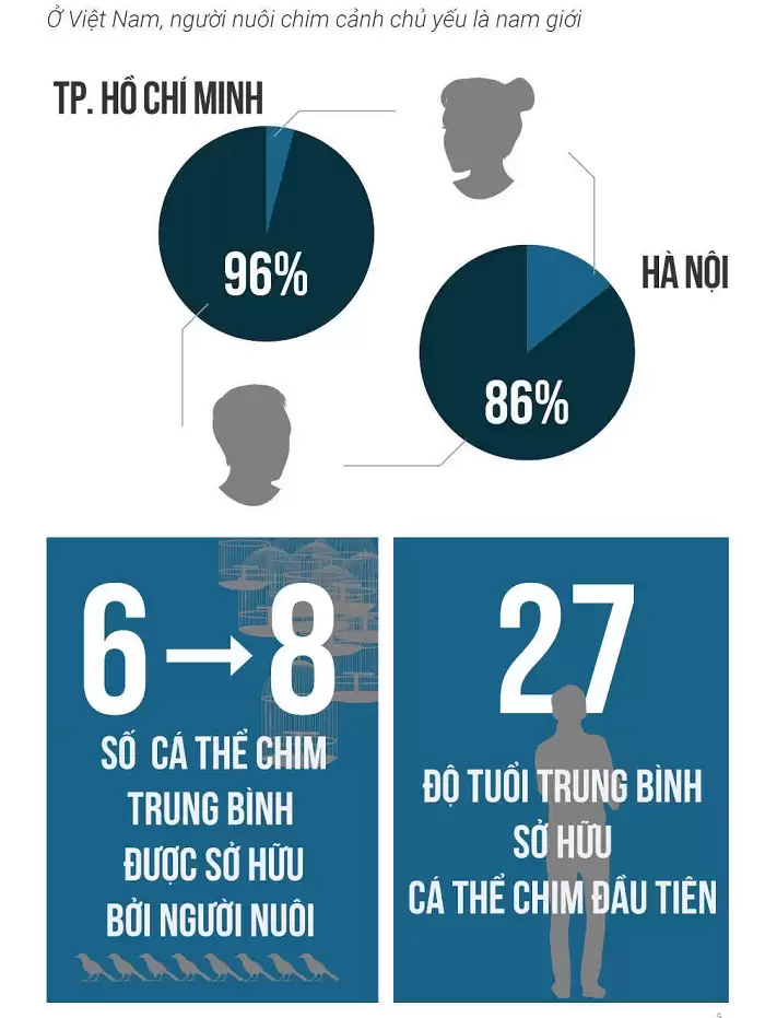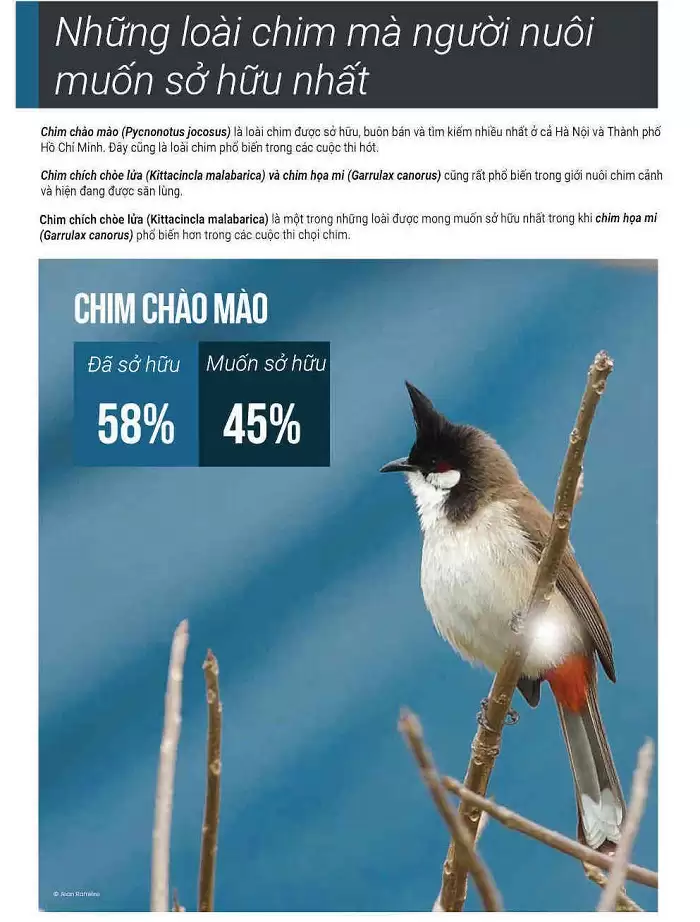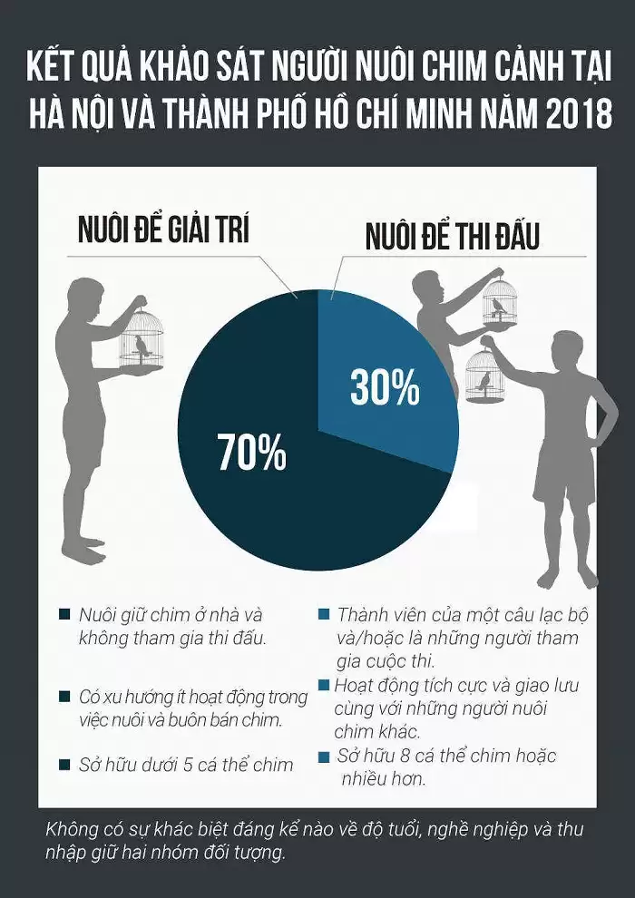 Trong một nghiên cứu kéo dài 3 ngày, TRAFFIC ghi nhận tổng cộng 8.047 cá thể chim từ 115 loài bị bán tại hai thành phố lớn trong năm 2016. Trong số này có tới 90% loài không được pháp luật Việt Nam bảo vệ. Năm 2018, TRAFFIC khảo sát định tính (phỏng vấn sâu đối tượng nuôi chim, chuyên gia, chủ cửa hàng, hiệp hội chim cảnh) và định lượng (phỏng vấn 400 người qua bảng khảo sát), qua đó phát hiện một số thông tin đáng chú ý về sở thích, thái độ, nhận thức của đối tượng nuôi chim.