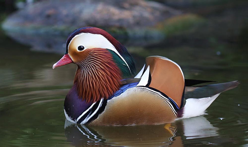 Con trống (còn gọi là uyên) có bộ lông sặc sỡ khó nhầm lẫn. Nó có mỏ đỏ, vệt lông hình lưỡi liềm lớn màu trắng phía trên mắt và mặt đỏ cùng “ria”. Ngực màu tía với hai sọc trắng theo chiều dọc, hai hông hung hung đỏ, với hai cụm lông giống như hai lá buồm màu da cam ở lưng. Con mái (còn gọi là ương) trông tương tự như con mái của vịt Carolina, với vành khuyên màu trắng quanh mắt và sọc chạy ngược về phía sau từ mắt, nhưng nhạt dần, nó có sọc nhỏ màu trắng bên hông và đầu mỏ nhạt màu.