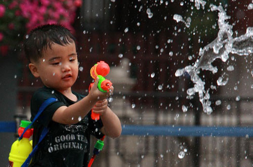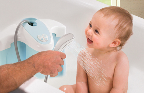 Để giúp trẻ không sợ nước, bước khởi đầu tốt nhất là để bé thích thú mỗi khi được tắm ở nhà. Có thể cho bé chơi trò “tắm mưa” dưới vòi hoa sen khi tắm. Nước vòi sen nhẹ nên các bé thường không sợ khi nước chảy từ đầu xuống và có vẻ thích thú trong thời gian tắm. Ảnh: kidsplaza