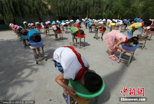 Một cách khác cũng giúp bé làm quen với nước là hướng dẫn các bé vốc nước lên mặt tự rửa rồi thấm lại bằng khăn, thay vì mẹ dùng khăn rửa cho bé. Ngoài ra, cha mẹ cùng con thi xem ai “lặn’ lâu hơn bằng cách úp mặt vào một bát nước cũng là phương pháp giúp bé tiếp cận với nước nhanh hơn. Ảnh: chinanew