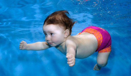 Trong bể bơi, hãy bế bé từ sau lưng, đồng thời nâng nách bé lên, cho bé đập tay đạp chân thỏa thích. Nếu muốn dạy bé cách ngưng thở khi ở dưới nước, hãy bắt đầu bằng việc để một người khác bế lấy bé, cha mẹ ở bên đối diện, thổi phù vào mặt bé để con nhắm mắt, nín thở rồi nhẹ nhàng đưa con hơi chìm xuống nước. Ảnh: songkhoe24